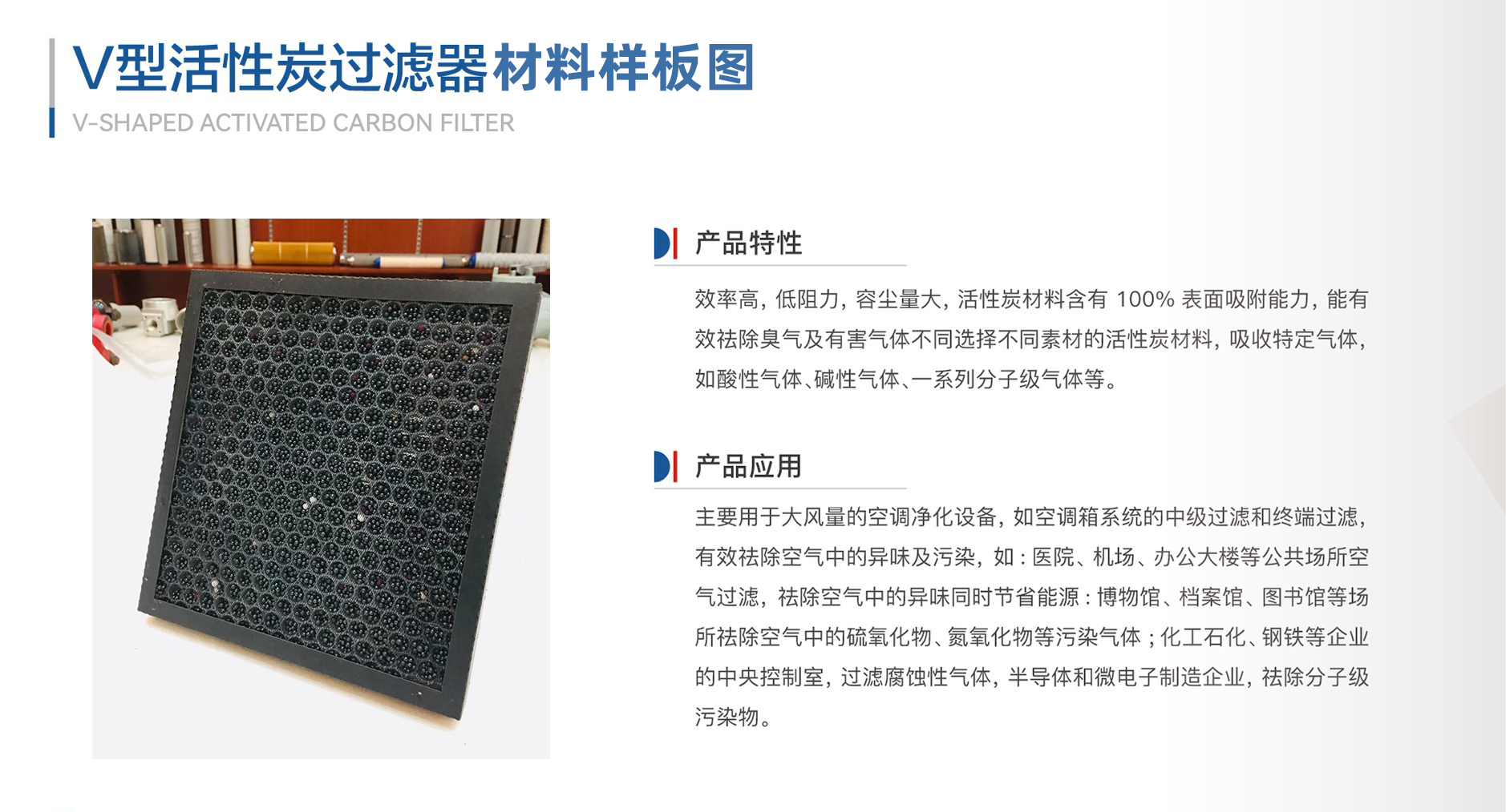 主要用于大風(fēng)量的空調(diào)凈化設(shè)備,如空調(diào)箱系統(tǒng)的中級(jí)過濾和過濾祛除空氣中的異味及污染,如:醫(yī)院、機(jī)場(chǎng)、辦公大樓等公共場(chǎng)所空氣過濾,祛除空氣中的異味同時(shí)節(jié)省能源:博物館、檔案館、圖書館等場(chǎng)所祛除空氣中的硫氧化物、氮氧化物等污染氣體;化工石化、鋼鐵等企業(yè)的中央控制室,過濾腐蝕性氣體,半導(dǎo)體和微電子制造企業(yè),祛除分子級(jí)污染物。
